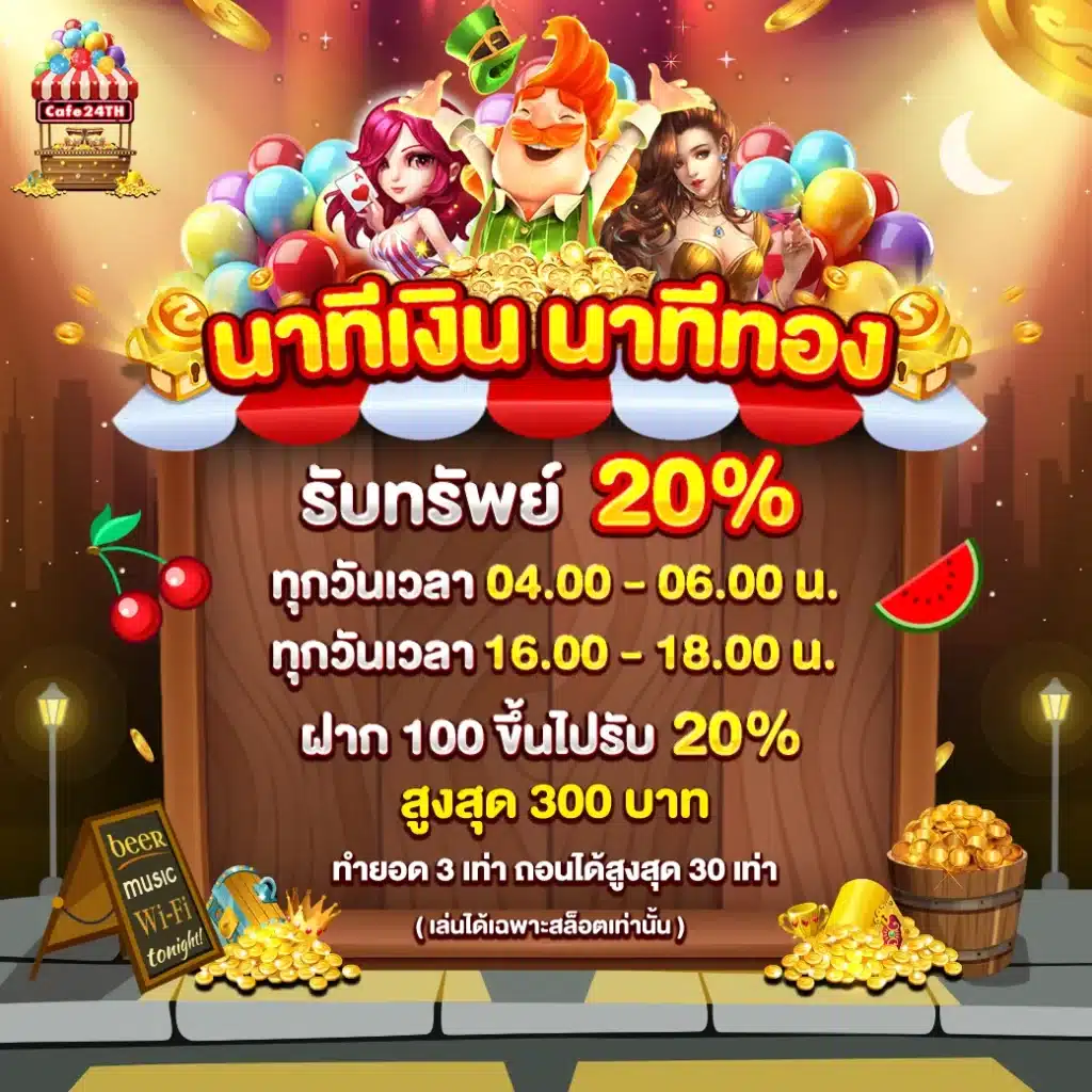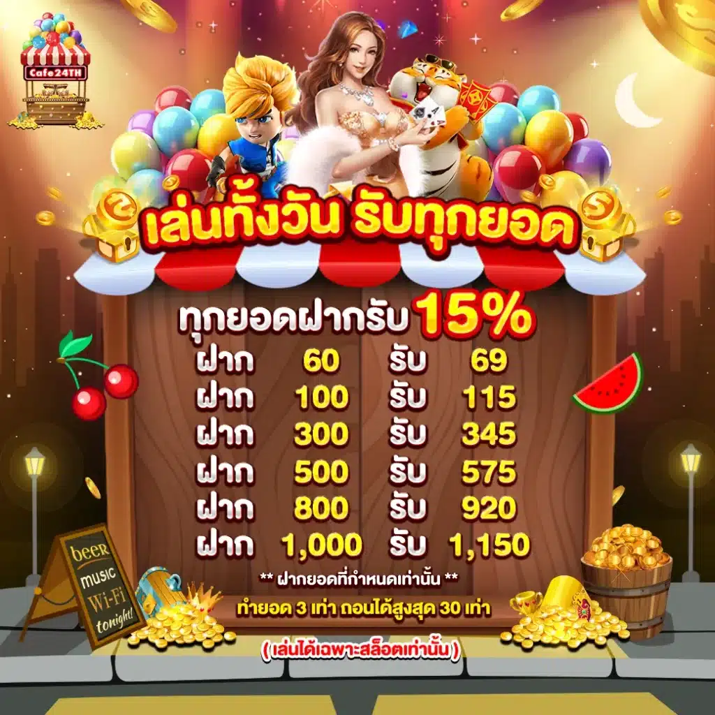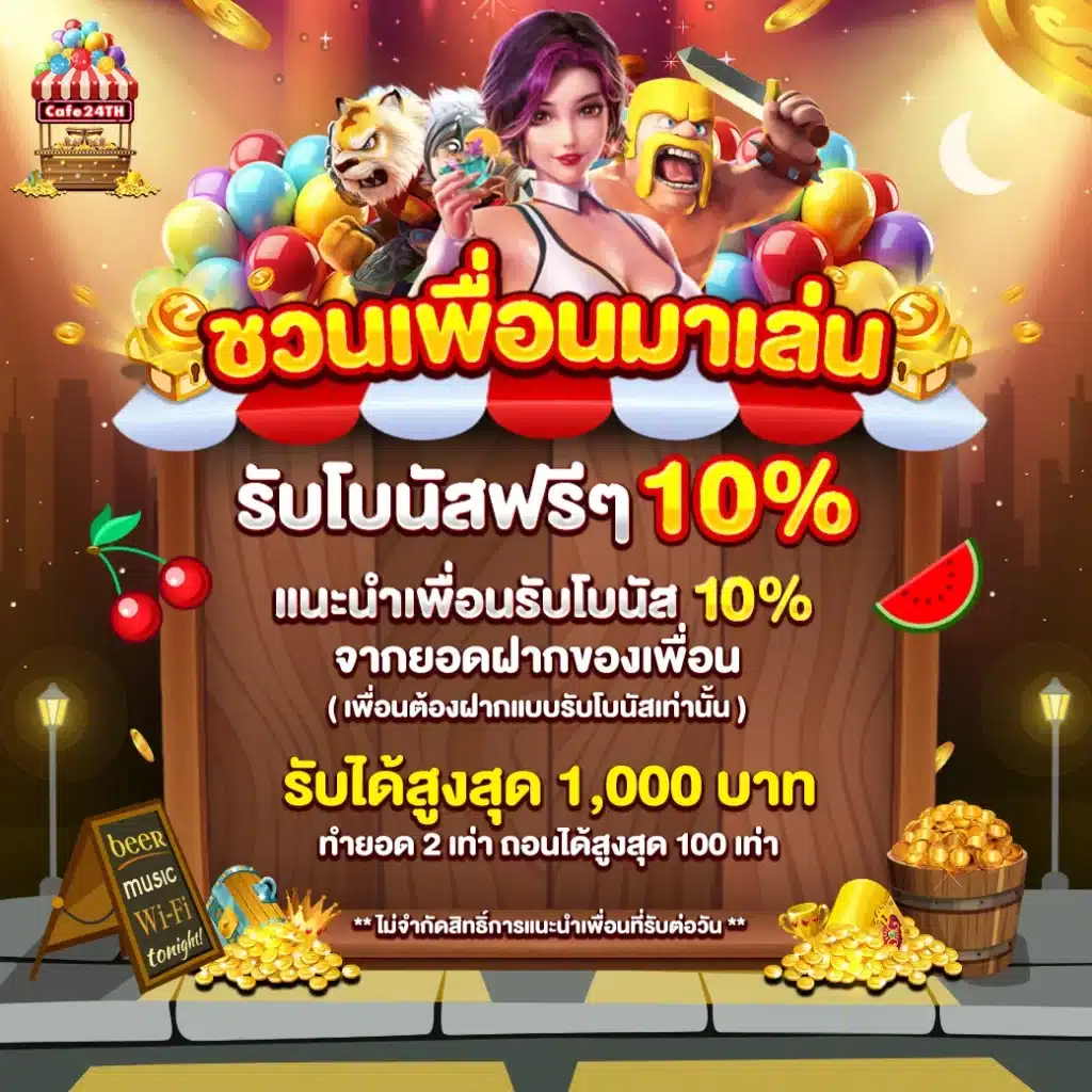 นอกจากนี้ยังมีโปรโมชั่นและสิทธิพิเศษมากมายสำหรับสมาชิกใหม่และสมาชิกปัจจุบัน เช่น โบนัสต้อนรับ เครดิตฟรี และแคชแบ็ค ที่ช่วยเพิ่มโอกาสในการทำกำไรให้กับนักพนัน ภายใต้การดำเนินงานที่ได้มาตรฐานระดับสากล ทำให้ cafe24th เป็นตัวเลือกอันดับต้นๆ สำหรับผู้ที่มองหาเว็บพนันออนไลน์ที่ครบครัน มั่นคง และน่าเชื่อถือ